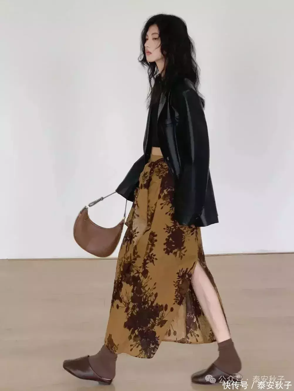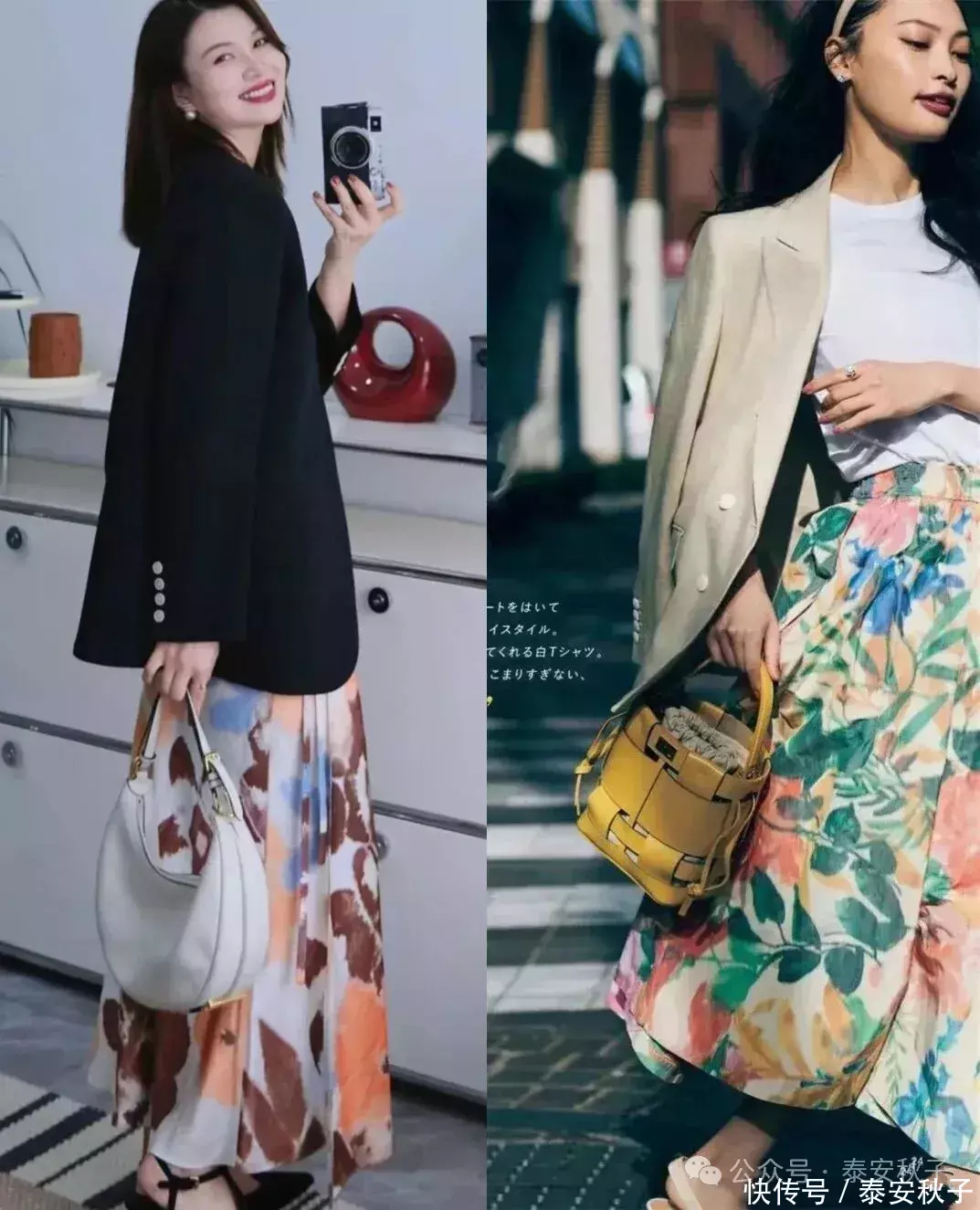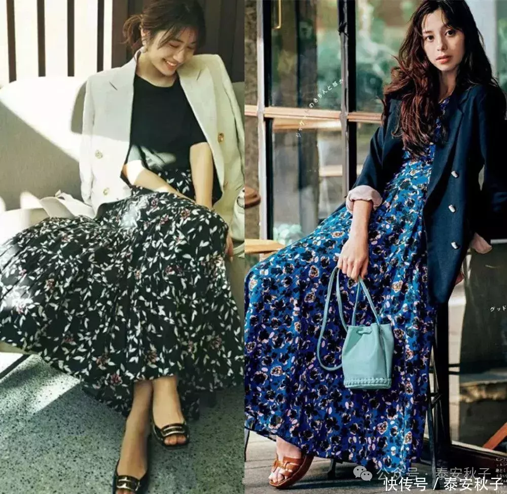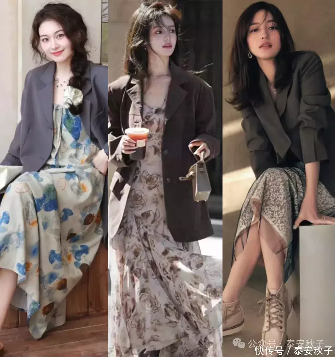 倘若你想在秋季里,穿出浪漫、精致的干练美感,就可以用帅气西装来搭配印花裙。